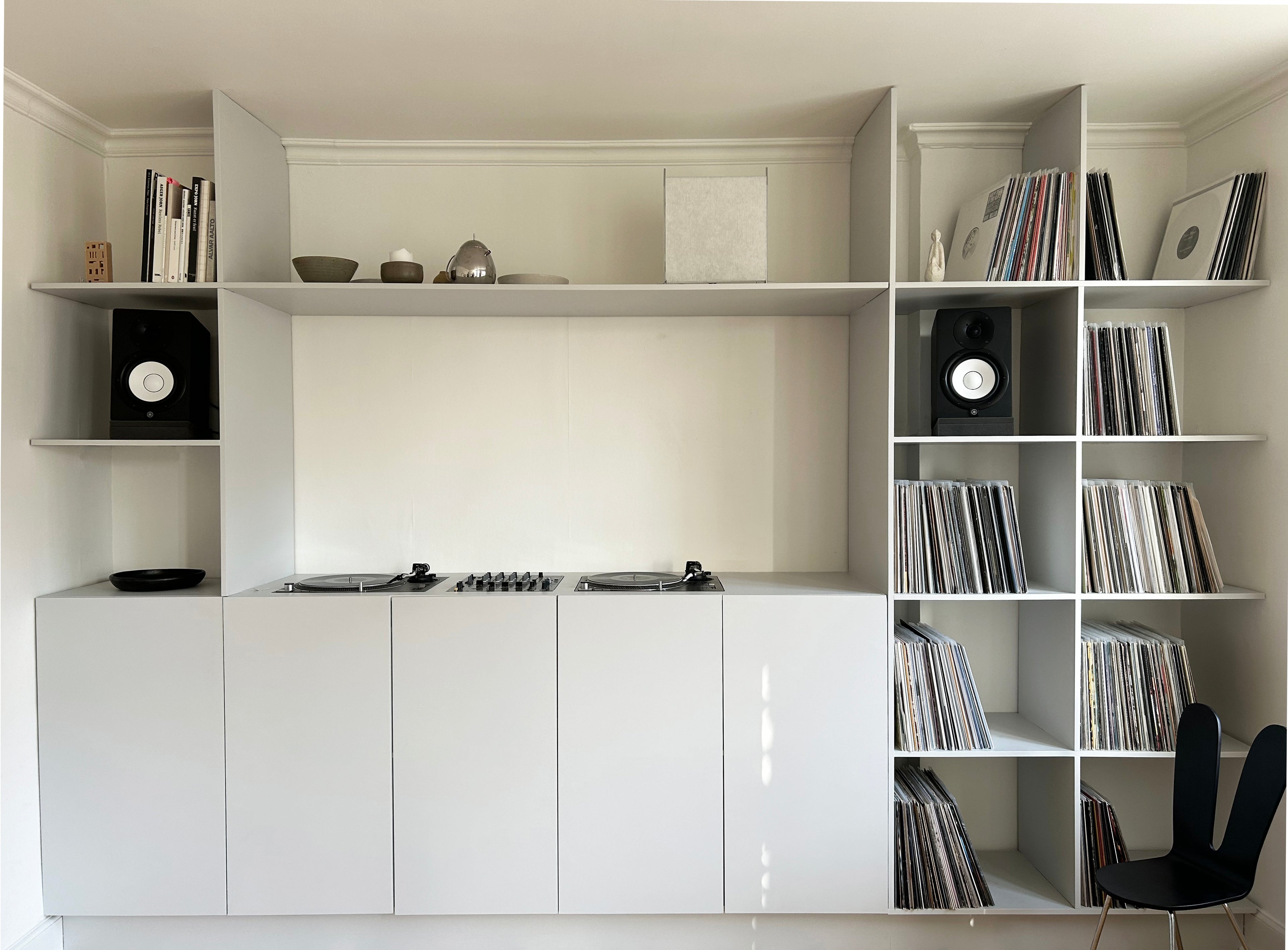 It was important for this build to perform ergonomically to the user's long-periods of standing, surfing backwards and forwards to select the right music. So while the desk surface was above waist height to promote good posture, we also applied sunken housing for the equipment so his wrists were never strained during extensive recording sessions.