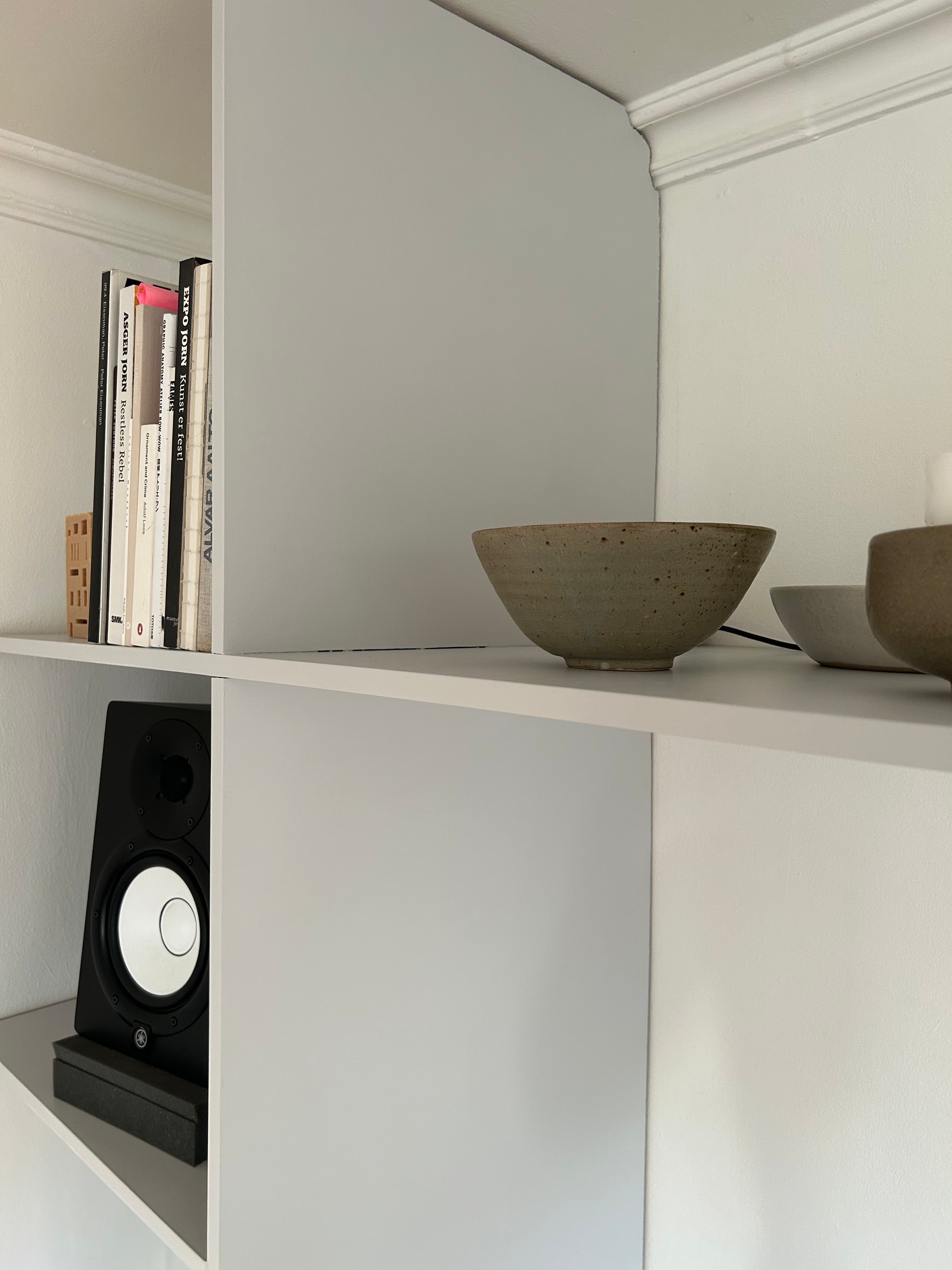 Apartments in Copenhagen can be up to 200 years old and under-law and heritage - must remain unchanged. Being an older building block and considering code, the ceiling/cornice junction would remain untouched. The solution was to build as close to the existing surfaces and give the illusion of pure integration to the wall. The result; a wall unit standing floor to ceiling of its own will and integrity.